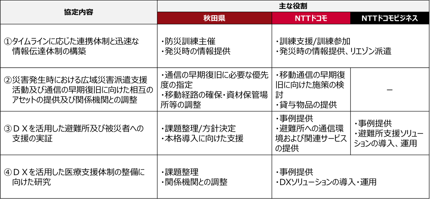 株式会社NTTドコモ(以下、NTTドコモ)では東日本大震災以降、通信サービスの早期復旧をめざし、平常時から災害を想定した訓練や地域間の連携強化を実施してまいりました。本協定締結により、発災時の広域通信確保に向けた相互協力を強固なものとするとともに、NTTドコモおよび法人事業を担うNTTドコモビジネス株式会社(旧NTTコミュニケーションズ株式会社、以下、NTTドコモビジネス)はDXを用いた避難所運営と被災者への支援の実証、医療支援体制の整備に向けた研究を秋田県と行うことで地域の防災力向上に貢献します。