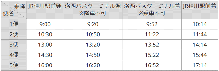 | 運行区間 | JR桂川駅前⇒洛西バスターミナル⇒(洛西ニュータウン周回)⇒洛西バスターミナル⇒JR桂川駅前 ※JR桂川駅前、洛西バスターミナルにおいて、乗降が可能です。 【運行ダイヤ】 ![]() |