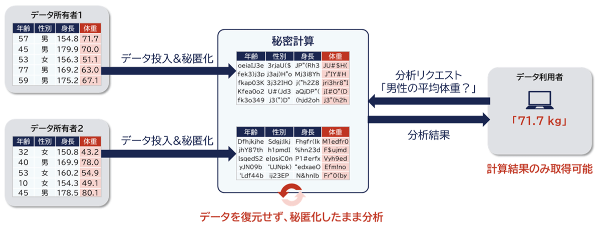 秘密計算は、高度な暗号理論を用いて、データを暗号学的秘匿化※1した状態のままで、データベース処理、統計分析、AIによる分析などができる技術です。プライバシー保護とデータ利活用の両立を実現する手段として、国内外で注目されるプライバシー強化技術(PETs)※2の一つとして期待されています。