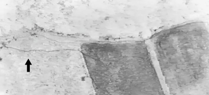 <ドローンを活用して発見した獣道 *矢印が獣道>