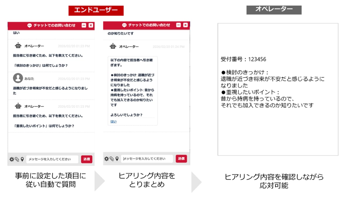 ※ 生成AIヒアリング機能は、ヒアリングオプションのご契約によりご利用いただけます。今後、AI対話型形式での自動応答についても実装を検討しています。