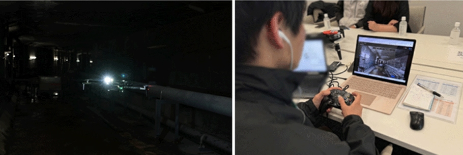 概要:本実証では、電波不感地帯・非GPS空間・暗所・狭小といった点検困難な地下施設を対象に、自律飛行型ドローン活用を主題として検証を実施しました。具体的には、緊急時に高技能パイロットを現地に配置できない状況を想定し、遠隔地※1からのドローン操縦の実効性検証、電波不感地帯におけるドローン操縦のためのネットワーク環境の構築、あわせて平時における構造物点検の経過観察や、発災後のドローン撮影画像との差分確認を目的としたデジタルツイン構築による検証を実施しました。