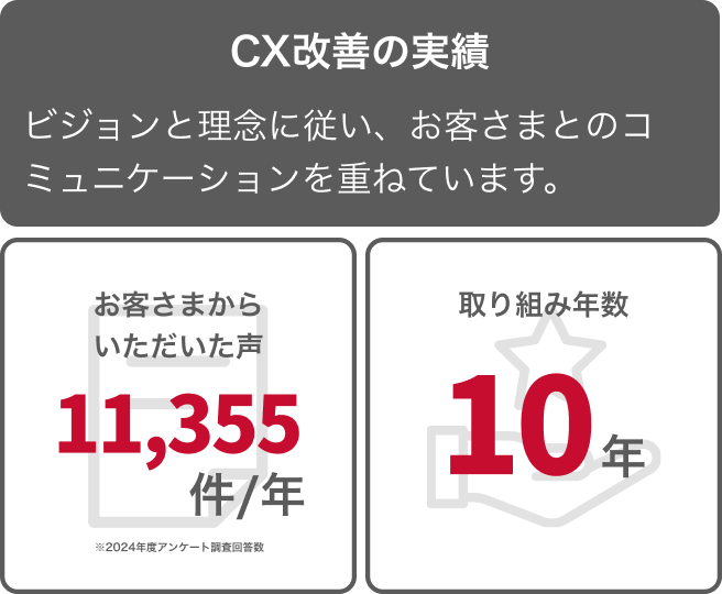 お客さまの期待を上回る、驚きと感動のCXをお届けできるよう、お客さまの声を起点とした改善活動に取り組んでいます。サービスへの総合的な評価に関する大規模なアンケート調査を実施しているほか、サービスをご利用いただいた際の営業担当者やコールセンターなどでの応対に対して、お客さまがご満足してくださったのかどうかを細かく確認。そこでいただいた声からお客さまのニーズや弊社への期待を把握し、サービス改善や営業活動などの改善につなげています。