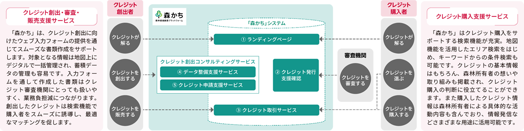 森林価値創造プラットフォーム「森かち」は、森林由来J-クレジットの「創出・審査・販売支援サービス」と「購入支援サービス」の2つのウェブサービスで構成されています。GIS(地理情報システム)を活用し、地図と紐づく形ですべてのデータが一括管理され、森林資源情報と位置情報の統合管理を可能にすることでクレジット創出者側と購入者側の双方をつなぐプラットフォームとしての役割を持っています。