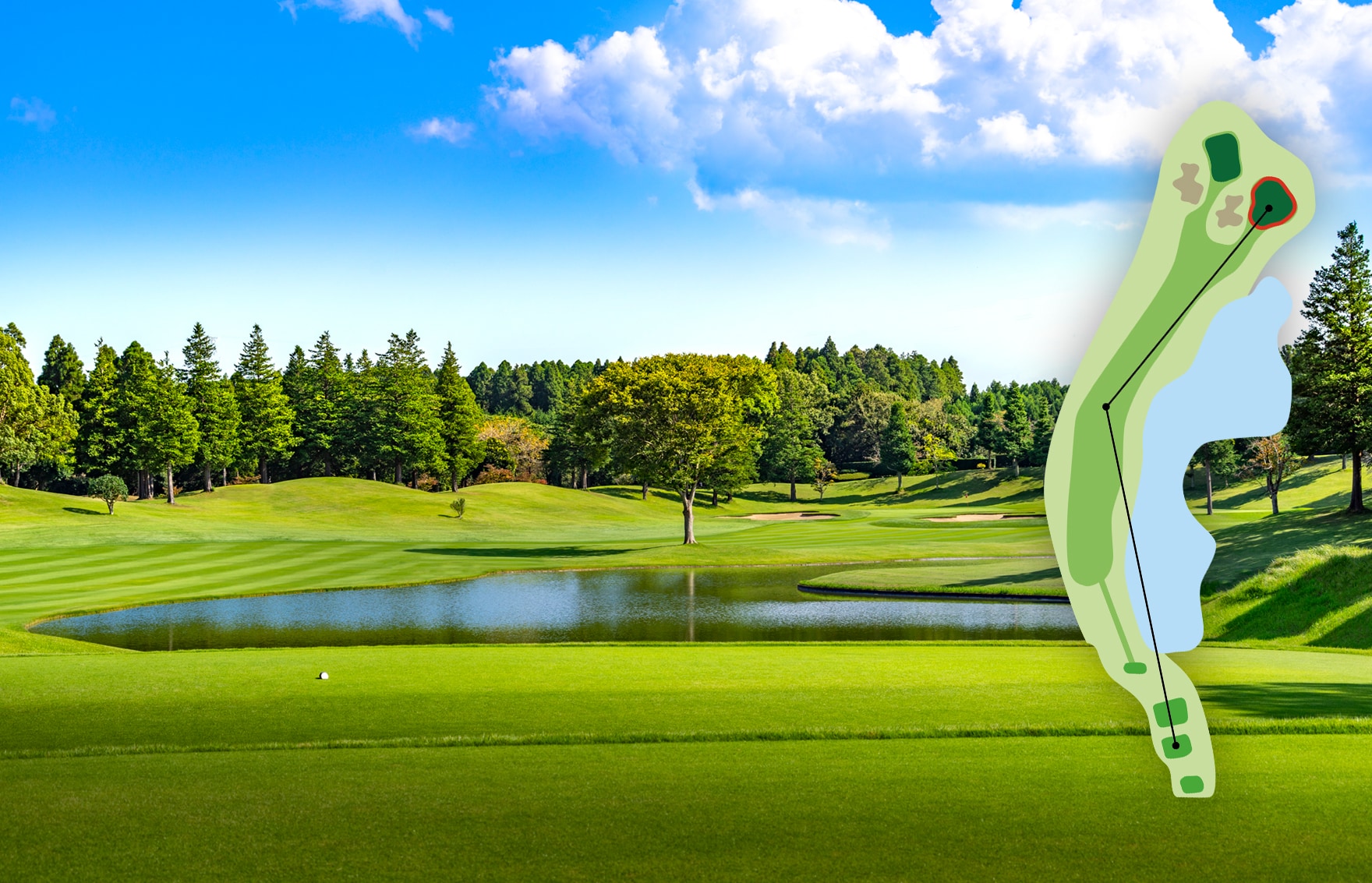 フェアウェイにも四敵する大きな池超えに挑戦。