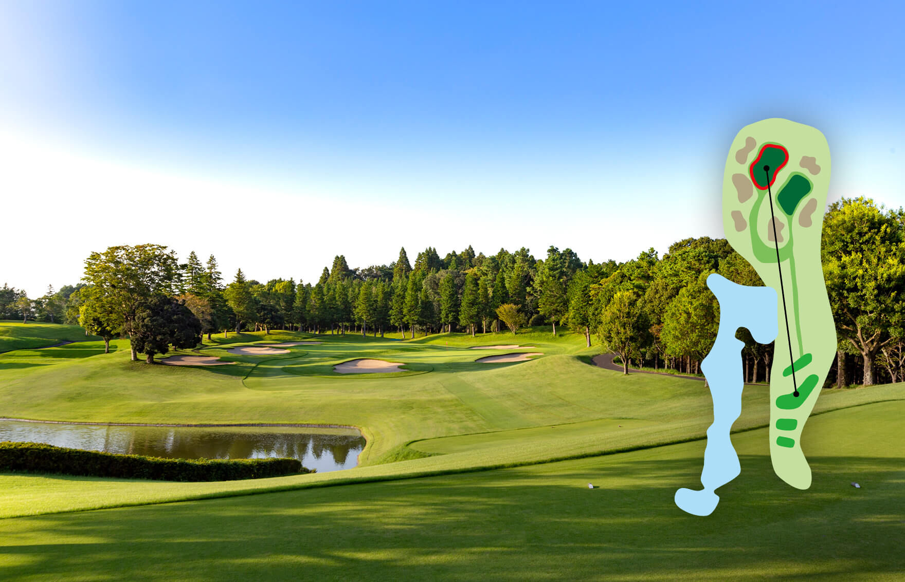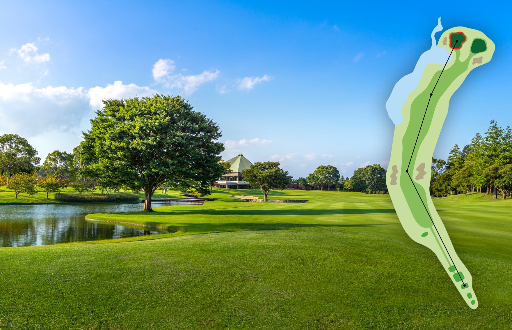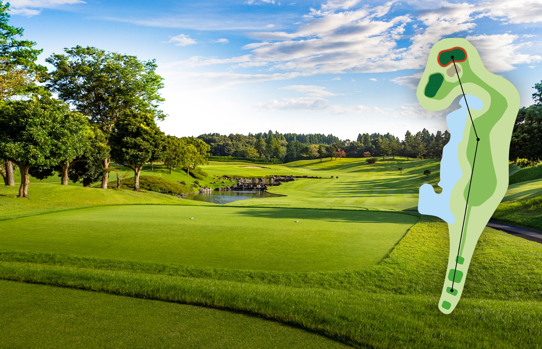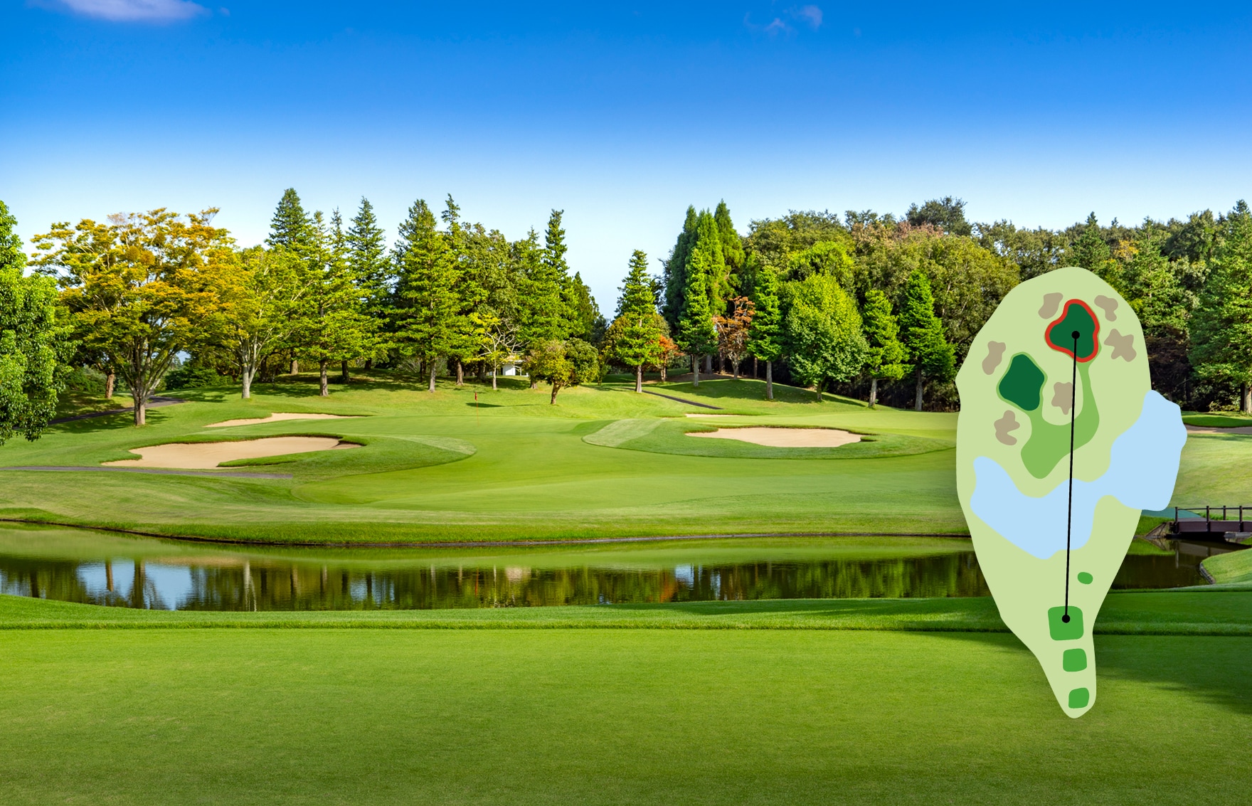美しさの中に、ドラマを秘めた、池越え砲台グリーン。