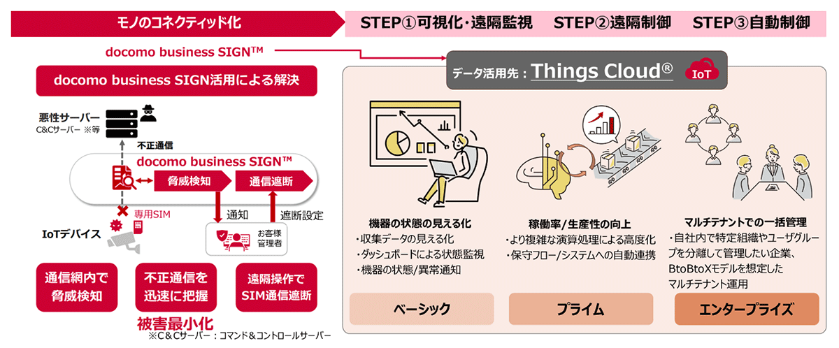 Things Cloudのみのご利用のほか、「docomo business SIGN™」のIoTデータ収集・可視化・制御機能としても2025年12月下旬(予定)よりご利用が可能です。