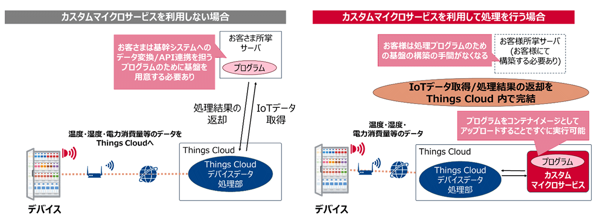 Things Cloudに蓄積されたIoTデータを利用し、お客さま独自プログラムを実行する環境とリソースを提供する「カスタムマイクロサービス機能」をオプションとして追加します。