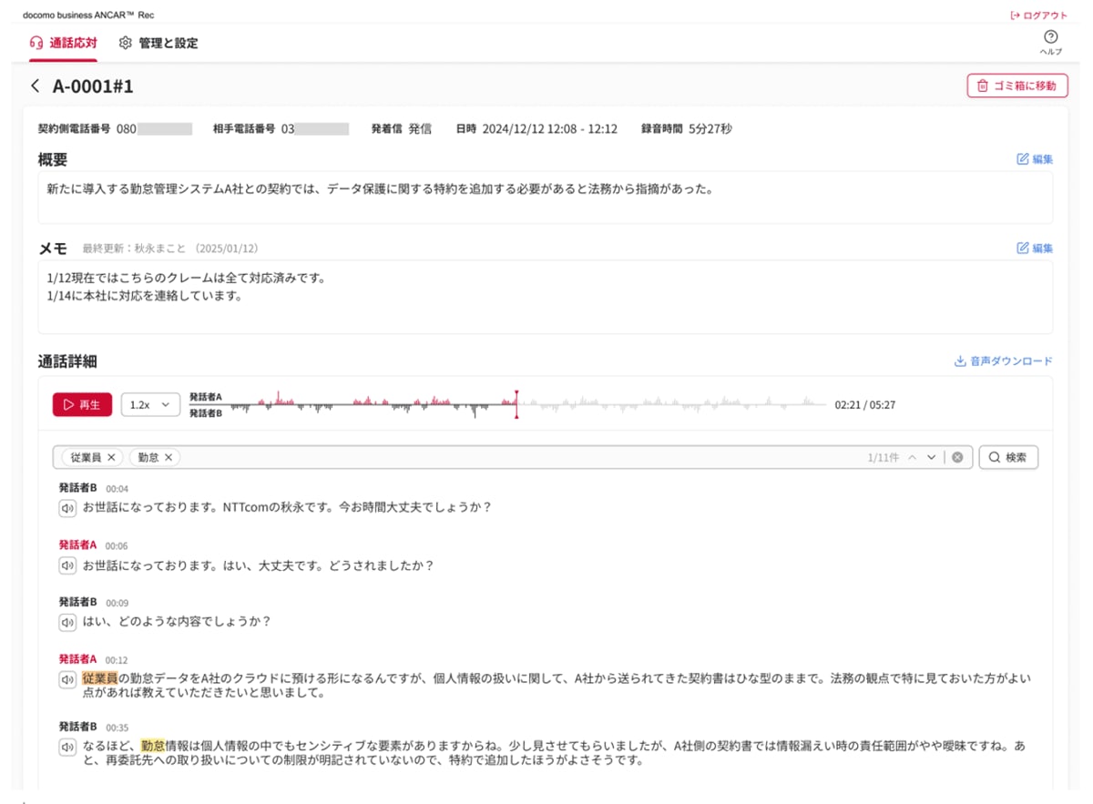 「docomo business ANCAR™ Rec」では、NTTドコモビジネスが提供するArcstar IP Voiceなどの音声コミュニケーションサービスの発着信通話を自動録音、管理します。また録音した通話を自動でテキスト化(Convert)することも可能です。カスタマーハラスメント対策やアフターコールワークの業務効率化などによるEX向上や、通話分析などに活用いただけます。