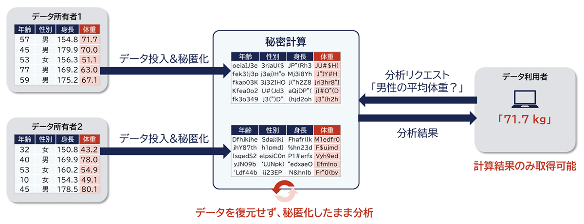 秘密計算は、高度な暗号理論を用いて、データを暗号学的秘匿化※1した状態のままで、データベース処理、統計分析、AIによる分析などができる技術です。プライバシー保護とデータ利活用の両立を実現する手段として、国内外で注目されるプライバシー強化技術(PETs)※2の一つとして期待されています。