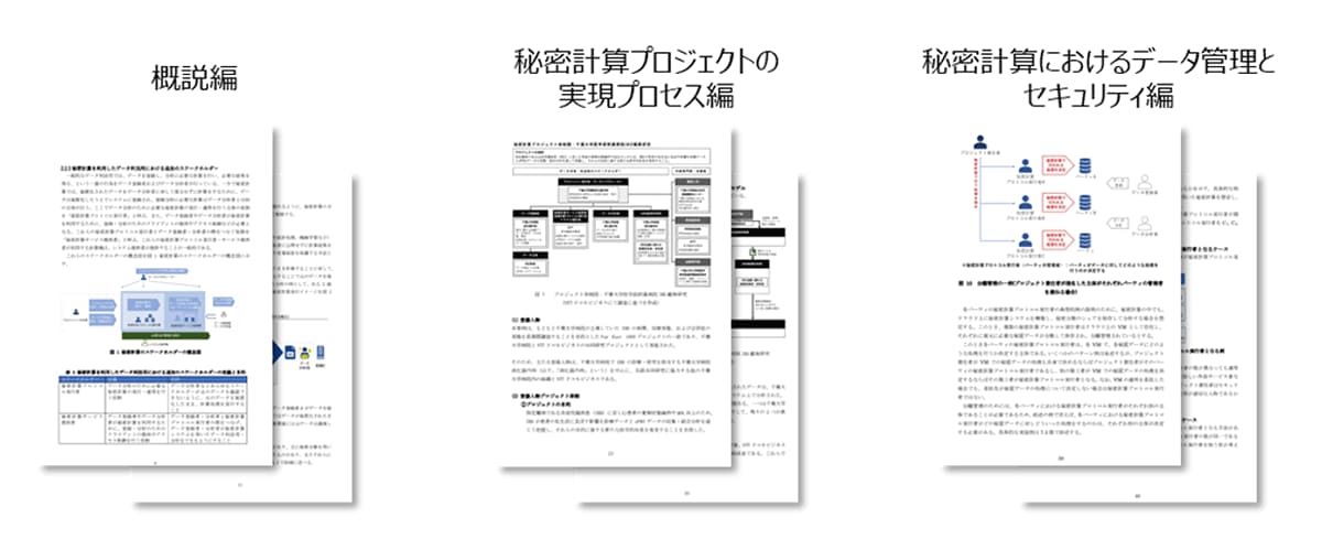 本ガイドラインは、「概説編」、「秘密計算プロジェクトの実現プロセス編※5」、「秘密計算におけるデータ管理とセキュリティ編」の3つの文書で構成しております。昨年度発信した中間報告文書に、準同型暗号を用いた方式のサービス例や、安全なデータ管理手法の具体例、および法的観点でのチェックリストの加筆などを行いました。