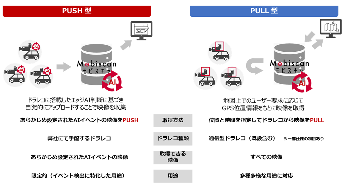 この度、AI道路工事検知ソリューション(以下 PUSH型)に加え、本機能の提供を開始しました。エッジAI側で検出した特定の映像を閲覧するPUSH型と異なり、本機能は特許技術によって、モビリティーパートナー(以下 MP)のシステムと本サービスを連携させるだけで映像を貯めることなく閲覧することができます。
