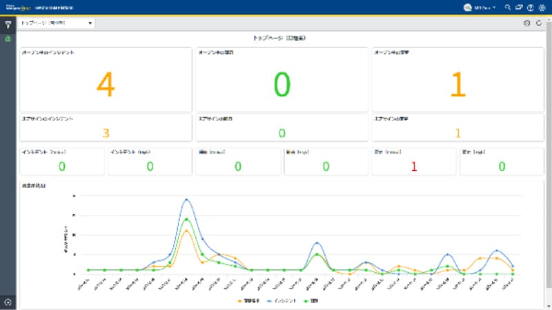 お客さま社内のICT運用担当者やマネージャーなど、各利用者の用途に応じたダッシュボード画面を提供します。ICT機器の状態をグラフなどで一元的に見える化することで、管理・監視業務やインシデント対応業務における生産性を向上します。