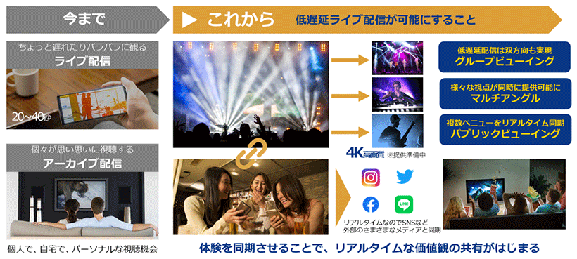 一方、一般的なライブ配信はリアルな現地イベントに対し数十秒程度のタイムラグが発生するため、オンライン環境におけるリアルイベントとの一体感創出や、ライブ映像を視聴しながらのSNS投稿など、他メディアを連動させたコミュニケーションが難しいという課題があります。NTT Comは、本サービスの提供によってこのような課題を解消し、臨場感の高いライブ配信のニーズにお応えします。