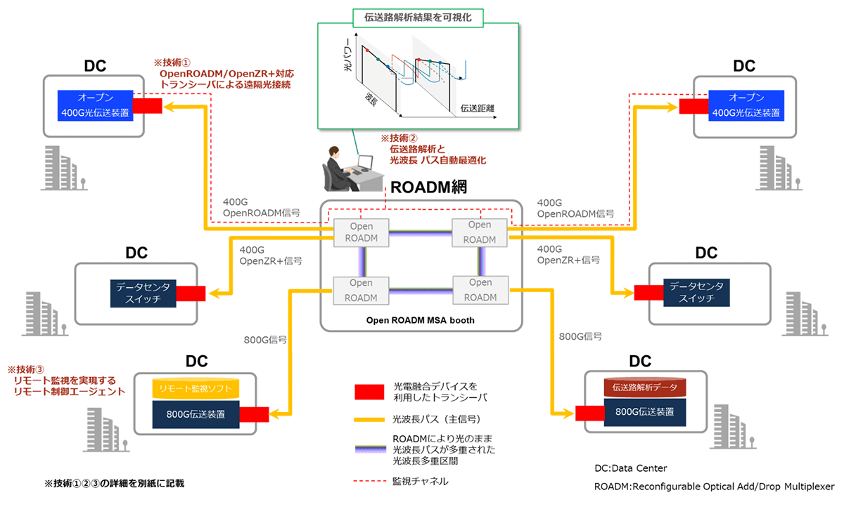 - 革新的データセンタエクスチェンジサービス実現に向け、IOWN Global Forum(※3)およびOpen ROADM MSA(※4)との連携により、マルチベンダでの400Gbps/800Gbps相互接続動作を実証