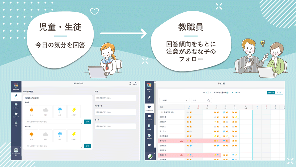 4つの選択肢から児童・生徒が自身のメンタルヘルスの状況に合う選択肢を回答し、教職員はその結果を確認することで、いじめ・不登校の早期発見を支援する機能です。