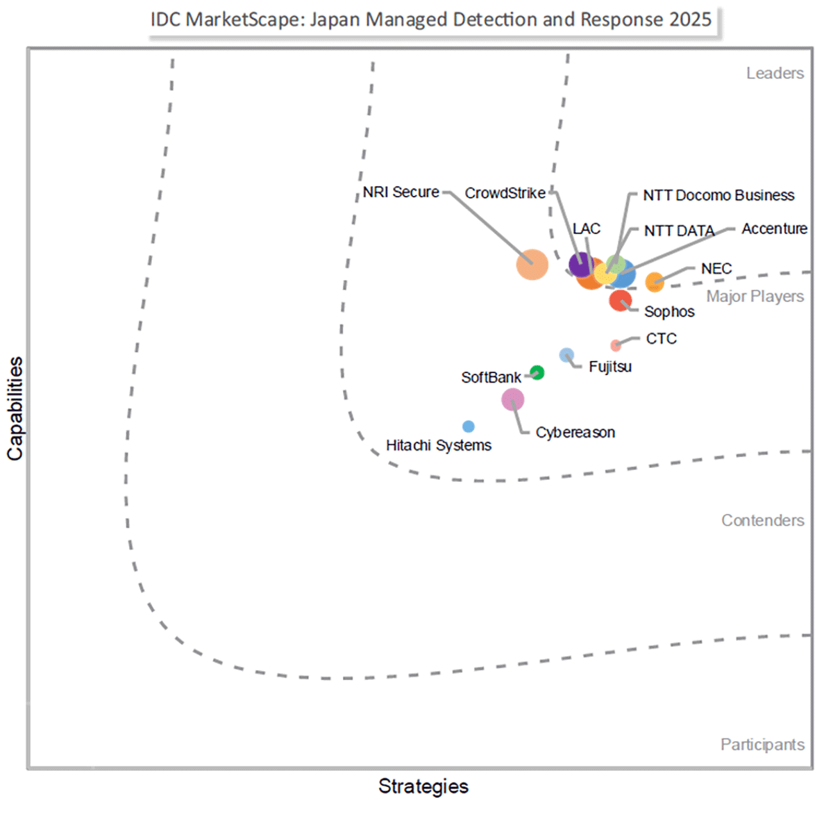 NTTドコモビジネス株式会社(旧 NTTコミュニケーションズ株式会社、以下 NTTドコモビジネス)は、米IDC社のレポート「IDC MarketScape:Japan Managed Detection and Response Services 2025 Vendor Assessment」(IDC#JPJ53015825, November 2025、以下 本レポート)において、最も高い評価であるリーダー(Leaders)のポジションに位置付けられました。