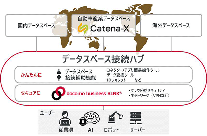 NTTドコモビジネス株式会社(旧 NTTコミュニケーションズ、以下 NTTドコモビジネス)は、企業がデータスペース※1へ“かんたん・セキュア”に接続できる「データスペース接続ハブ」のプロトタイプ(以下 本システム)を2026年2月26日より公開します。本システムは、さまざまな機能を柔軟・リーズナブルに利用できる次世代型統合ネットワークサービスのNaaS(Network as a Service)※2とデータスペースを利用するために必要な機能を統合し、国内企業の現場から簡単な操作で安全にデータスペースにつながる仕組みを提供するものです。