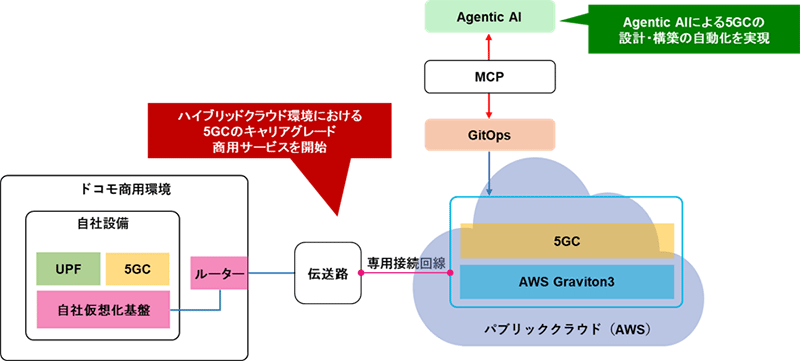 さらに、ドコモとNTTドコモビジネス株式会社(以下、NTTドコモビジネス)は、NTTドコモソリューションズ株式会社(以下、NTTドコモソリューションズ)と、世界で初めて※1ハイブリッドクラウド環境におけるAIとGitOps※2からなるAgentic AI※3を用いた5GCの設計、構築の自動化に成功しました。これにより、人為ミスの防止や構築期間の従来比約80%短縮を実現しました。なお、AWS上で構築した商用の5GCは、Agentic AIを活用して構築しています。