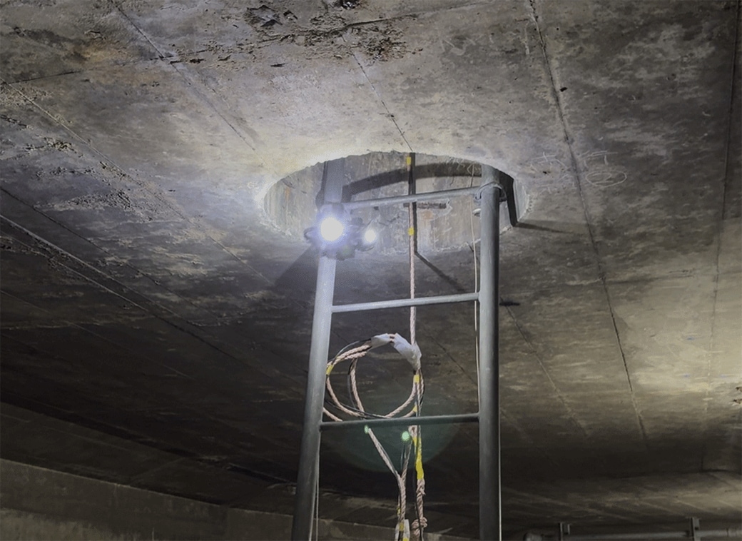 概要:対象箇所への進入ができない場合を想定し、マンホール上から延長アンテナを用いて換気ダクト内に通信環境を構築することで通信を確保し、マンホール上部から遠隔操作にて飛行延長の確認や構造物の詳細点検を実施