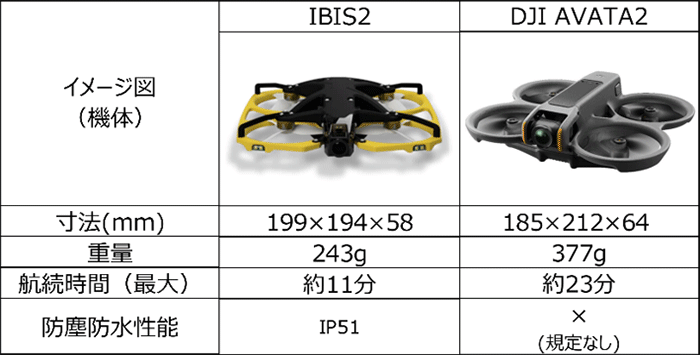 | 飛行安定性 | IBIS2およびAVATA2ともに飛行安定性は保たれていた。 また、照明間の暗部においても、飛行中にぶれることなく、ともに安定した飛行が可能であった。 |