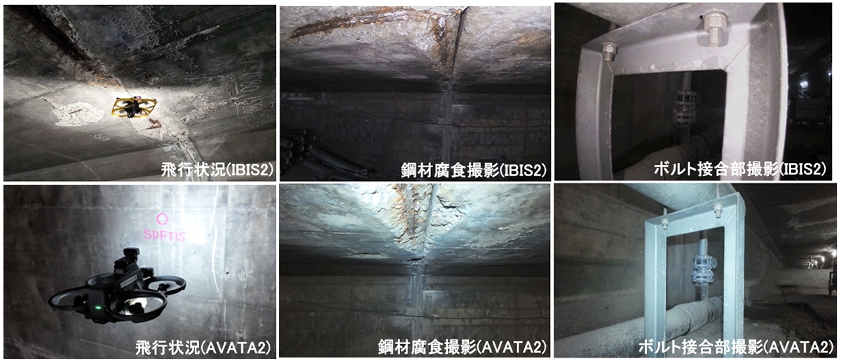 | 操作性・環境 | IBIS2は上下左右の細やかな微調整が行えるため、 飛行性能を最大限に活かすには一定の習熟度が求められるが、狭小空間内でも思い通りに機体を動かすことが可能であった。 また、防塵性能が高い機体となっており、粉塵が舞いやすいダクト内でも安定して運用が可能であった。 一方で、AVATA2はIBIS2ほど細かな操作を意識せずとも安定して飛行するため、比較的容易に操縦が可能であった。 |
