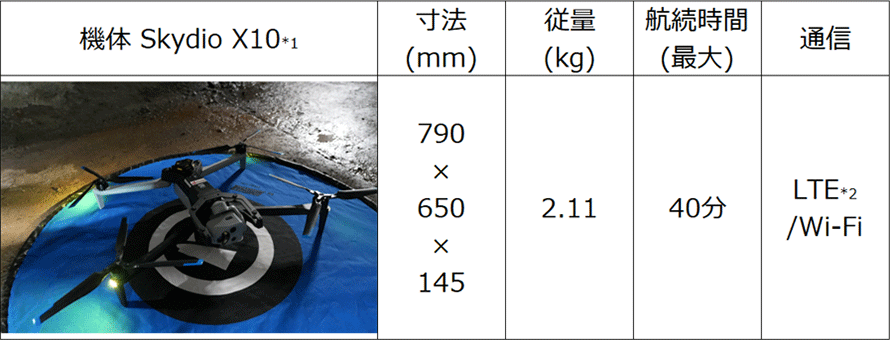 電波不感地帯における遠隔操縦および映像配信に用いたドローン「Skydio X10」の概要は以下の通りです。