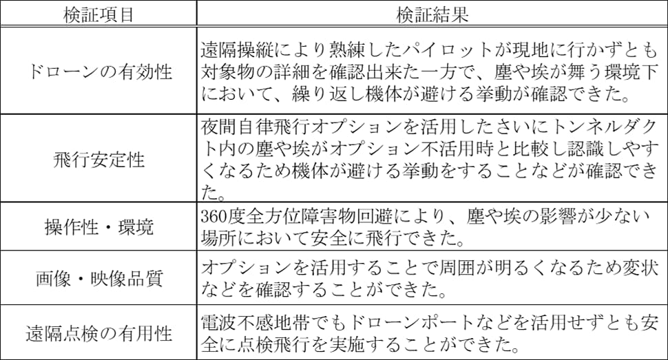 本実証の結果、狭小空間における機体選定や点検手法及び遠隔地からの点検に向けて有益な検証結果を得ることができました。一方で、狭小空間内の粉塵による機体への影響や通信環境の構築、機体選定と機体特性に応じた、操縦の熟練度が必要であることなど、今後の運用に向けた課題を確認しました。