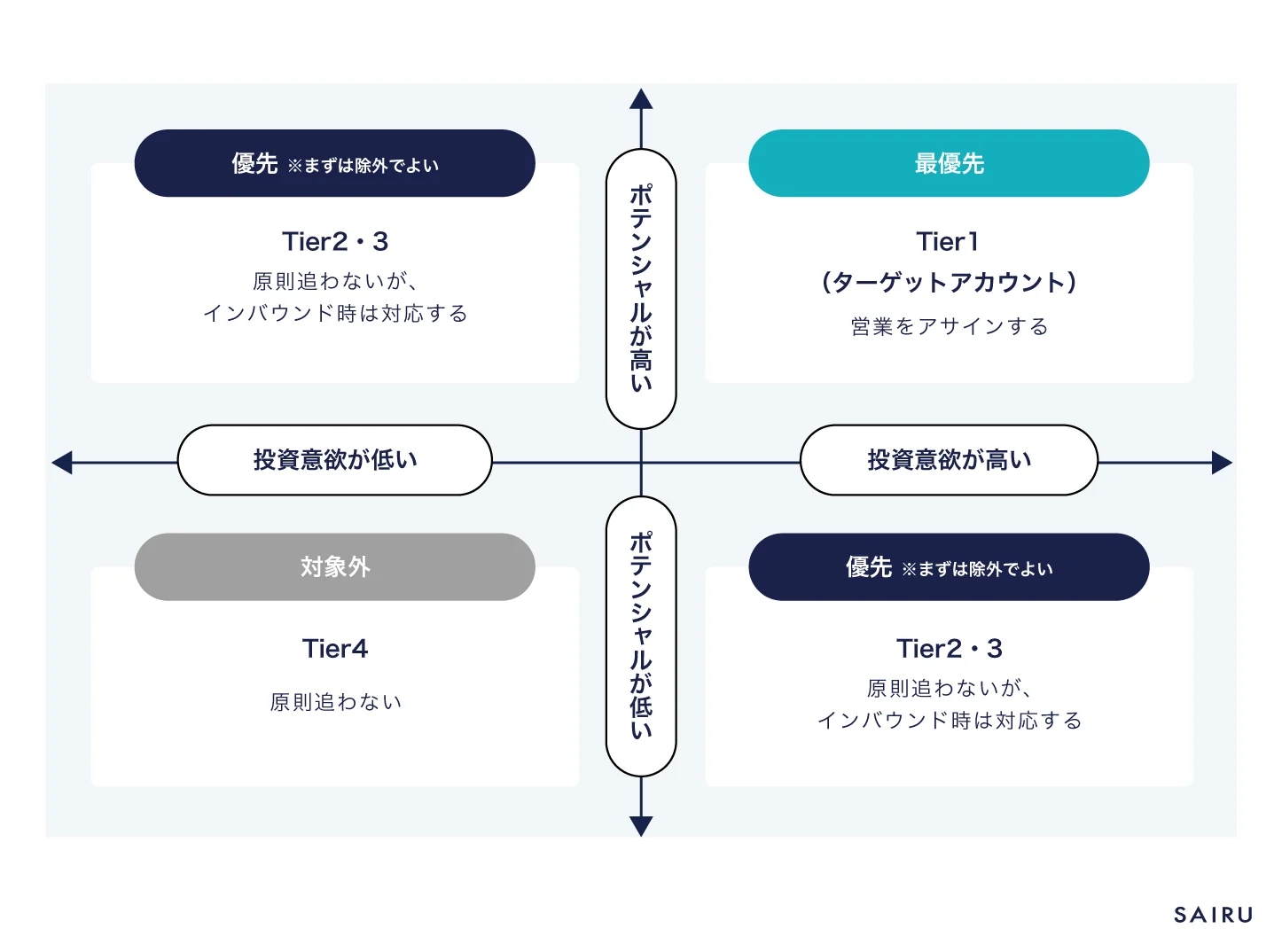 ABMのターゲットアカウントのセグメントは、投資意欲と自社へのポテンシャルの高さ(LTVが高い可能性があるか)の2軸から定義することをおすすめします。