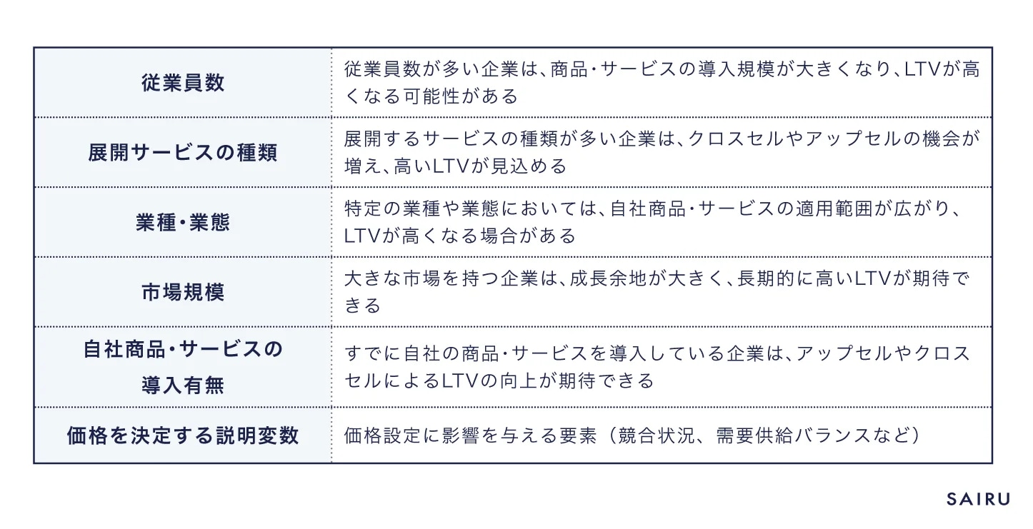 一例として、次のような要素が挙げられます(企業により高LTVを実現する要素は異なります)。