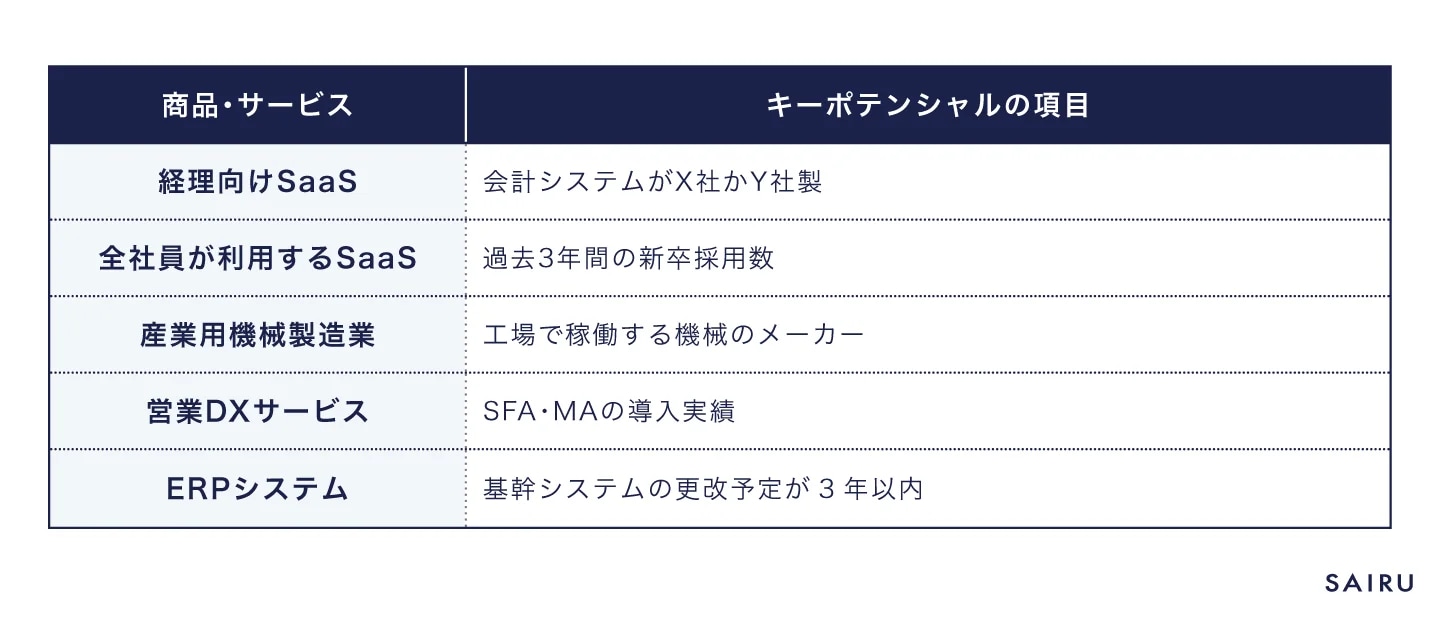 次の表は、キーポテンシャルの例です。意外な項目がキーポテンシャルになる可能性があります。