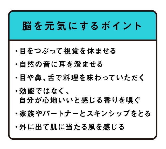 脳を元気にするためのポイントは、「視覚(見る)」「聴覚(聴く)」「嗅覚(嗅ぐ)」「味覚(味わう)」「触覚(皮膚で感じる)」の五感を意識すること。目や耳、鼻などの感覚器を使うことで、脳にダイレクトに刺激が伝わるからです。