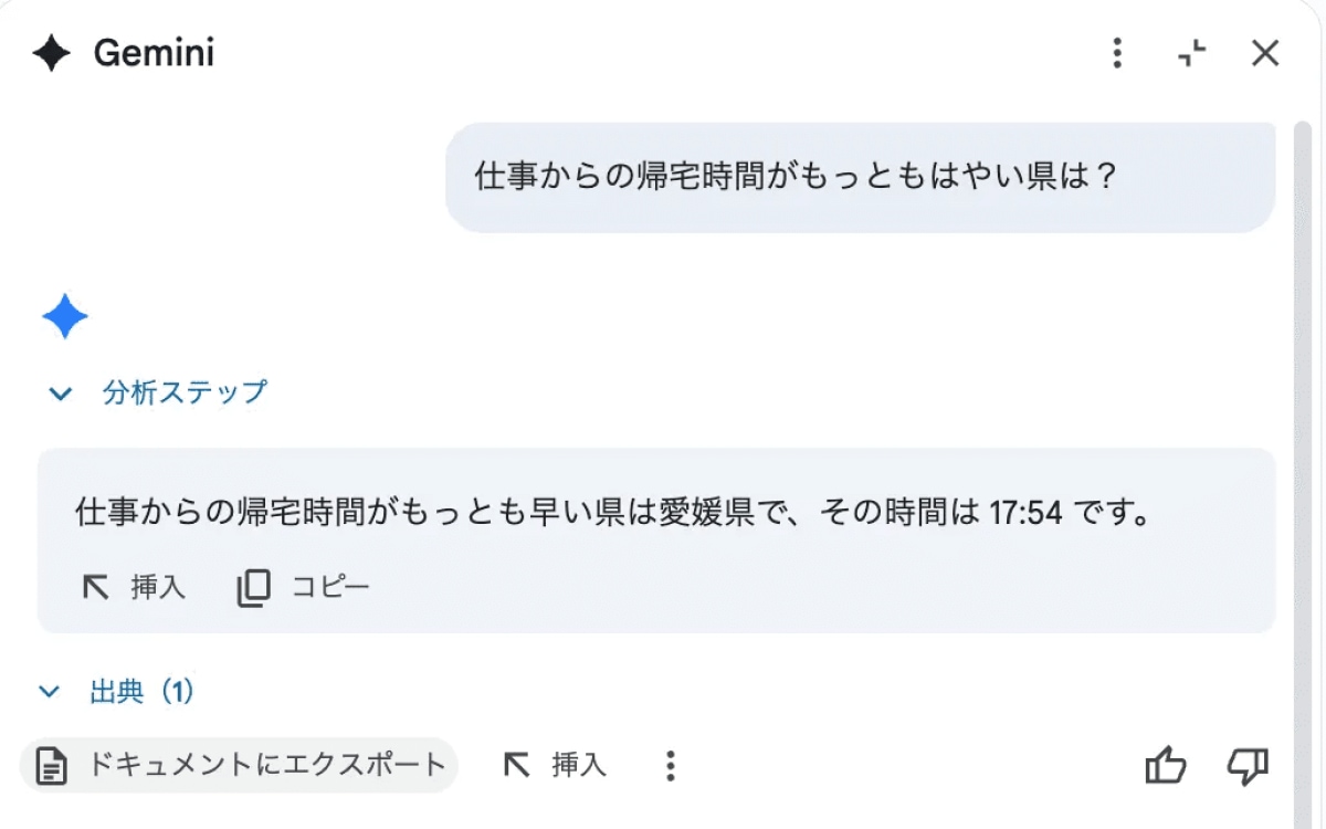Geminiは「帰宅時間」というキーワードから該当する列を見つけ出し、最も早い時間を探し出してくれました。