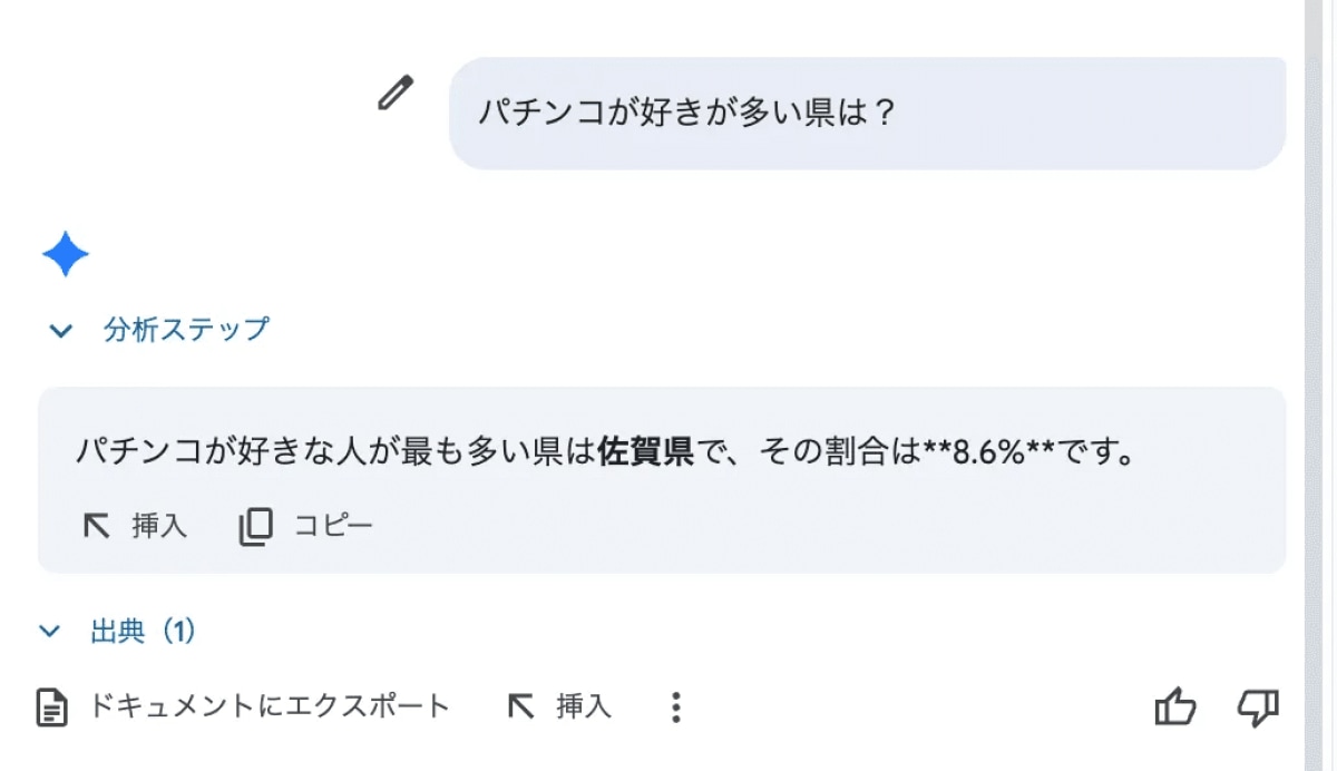 「パチンコ好きが多い県は?」と入力。A. 佐賀県(鹿児島県も僅差で多い)