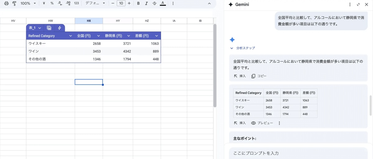 Geminiは、全国平均のデータと静岡県のデータを比較し、消費金額の差が大きい品目を割り出してくれました。