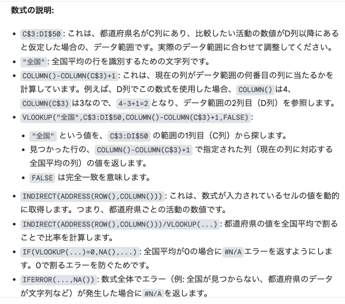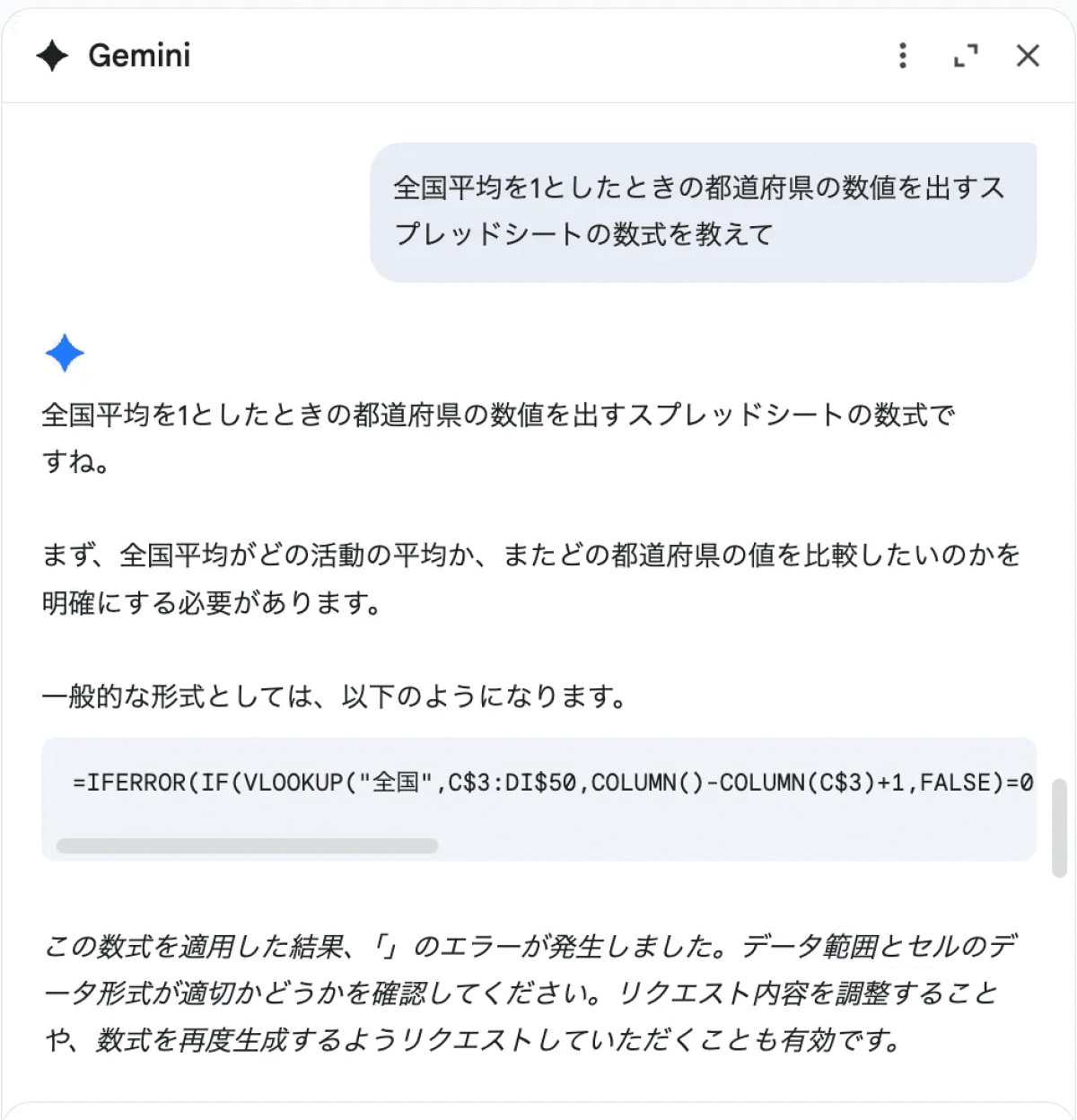 例えば、「全国平均を1とした時、各都道府県の数値を出すスプレッドシートの数式を教えて」と聞くと、`INDIRECT`関数などを使った少し複雑な数式を、その解説付きで提案してくれます。