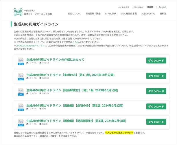 そのため、ゼロから自作するのではなく、JDLA(一般社団法人日本ディープラーニング協会)が公開している生成AIの利用ガイドラインのひな形など、すでに世の中に出ているテンプレートをうまく活用するのが近道だと佐久間氏は助言します。