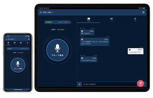 - トランシーバーやインカムに代わり、音声や映像を1:Nへリアルタイムに配信できるコミュニケーションアプリ。簡単操作で、現場側、管理側両方の業務効率化を実現可能。