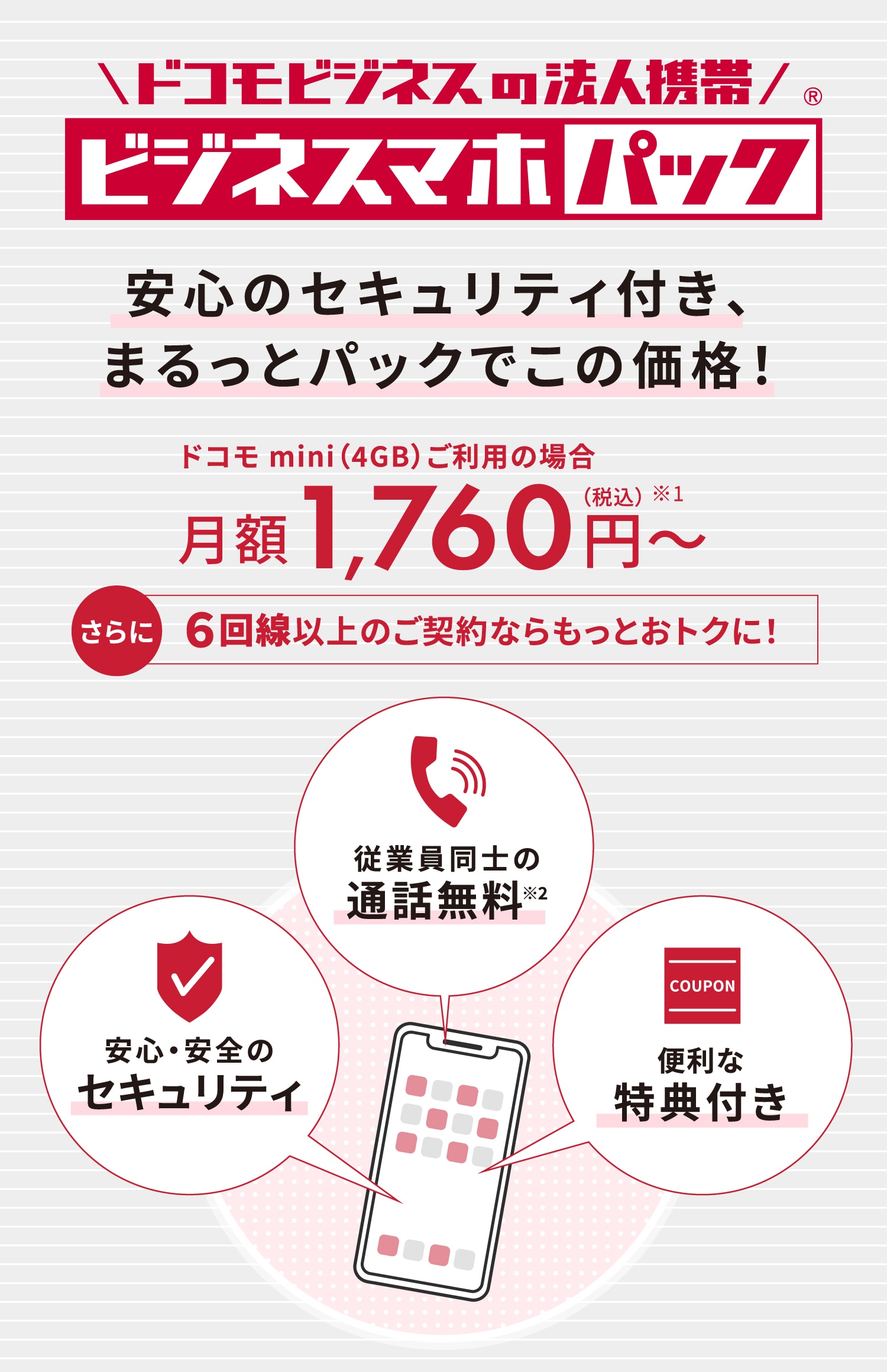 ※1 機種代金、通話料等が別途かかります。ドコモ光セット割/home 5Gセット割、ビジネスメンバーズ割を適用した料金です。 ※2 「従業員」とは、同一「ビジネス通話割引」グループをさします。「ビジネス通話割引」でグループ内の国内通話が無料になります。「ドコモ mini」をご利用の場合は、グループ内の国内通話無料などの各種割引は適用されません。*料金の詳細は、料金にてご確認ください。