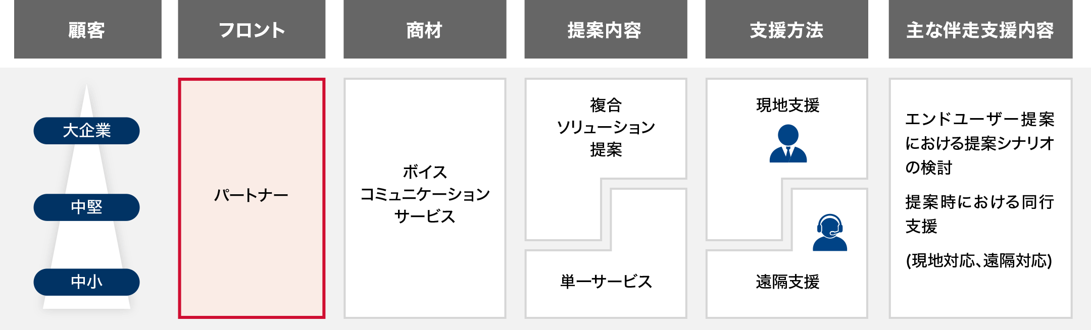 弊社の販売支援組織が現地支援と遠隔支援の両輪で、提案内容に応じた効率的な支援を実施いたします。