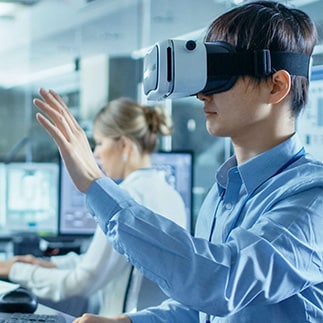 ヘッドマウントディスプレイとコントローラを用いて、3Dデザインの共有や共同制作を遠隔拠点間で実現します。