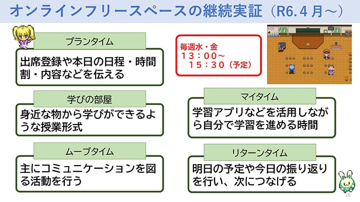 その方法として、NTTドコモビジネスの協力のもと実証実験を進めてきたのが、メタバースを利用したオンラインフリースペースです。ここでは、子どもたちが入りやすく楽しさを味わえることを大切に、運営を工夫しています。