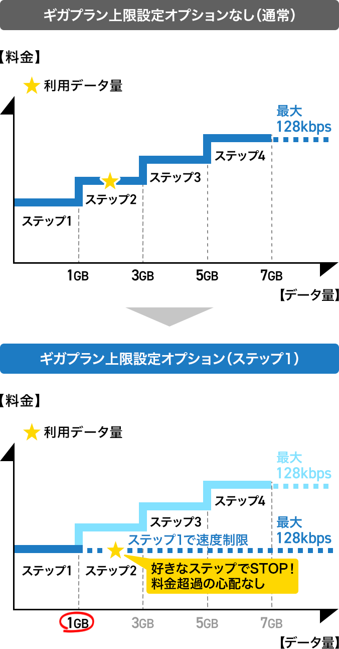 「ドコモBiz データ無制限」「ドコモ MAX」「eximo」「5Gギガライト」または「ギガライト」のお好きなステップで、通常速度での利用可能データ量の上限を設定可能です。上限設定をすることで指定したステップの上限を超える通信が発生した際に、自動で速度制限がかかり、ご請求が指定したステップの料金のみとなります。