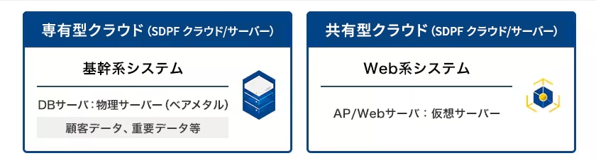 NTTドコモビジネスの「SDPF クラウド/サーバー(旧名称 Enterprise Cloud)」は、専有型(Hosted Private Cloud、ベアメタル含む)と共有型(パブリッククラウド)両方具備したクラウドなので、顧客データや重要データを管理するDBサーバは専有型クラウドに、アプリケーション/WEBサーバなどは共有型クラウドに構築することができます。