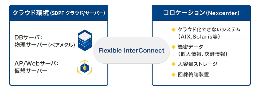 NTTドコモビジネスのSDPF クラウド/サーバー(旧名称 Enterprise Cloud)では、次世代インターコネクトサービス「Flexible InterConnect」をご利用する事でハイブリッドクラウド、マルチクラウド、オンプレミス及び他社クラウド含む複数クラウドやデータセンター(コロケーション)間を柔軟に接続し、セキュリティ/コストパフォーマンスの高い最適なシステム構成を実現することができます。