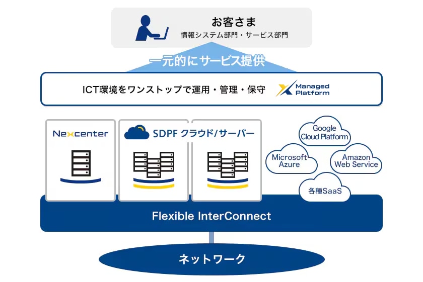 NTTドコモビジネスは、自社サービスであるSDPF クラウド/サーバー(旧名称 Enterprise Cloud)やNexCenterサービスだけではなく、複数拠点、お客さまが構築したオンプレミス、または他社サービスなどを含むICTシステム全体の運用管理を、24時間365日ワンストップで提供します。