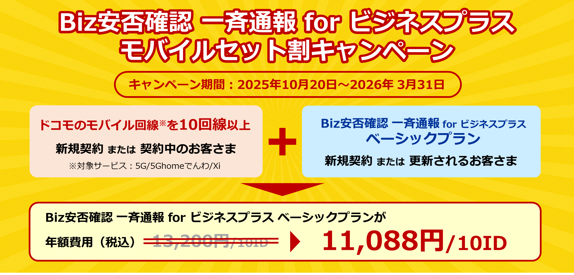 Biz安否確認/一斉通報では、ビジネスプラスにて提供している「Biz安否確認 一斉通報 for ビジネスプラス ベーシックプラン」(以下、ビジプラ ベーシックプラン)を対象に、NTTドコモが提供するモバイル回線をお持ちの法人のお客さま向けにキャンペーンを実施いたします。