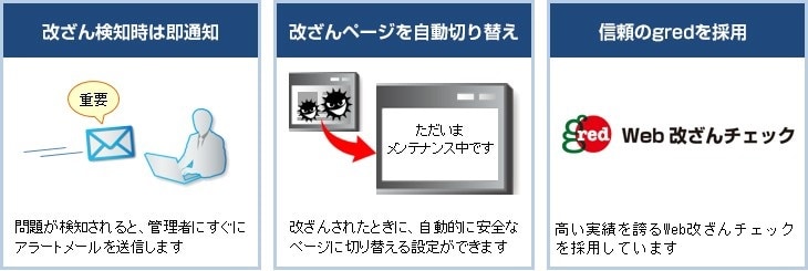 | アラートメール | 改ざんを検知した場合、管理者にアラートメールが配信されます。メールには改ざんページのURLと、改ざん内容 詳細ページへのリンクが記載されています。 |