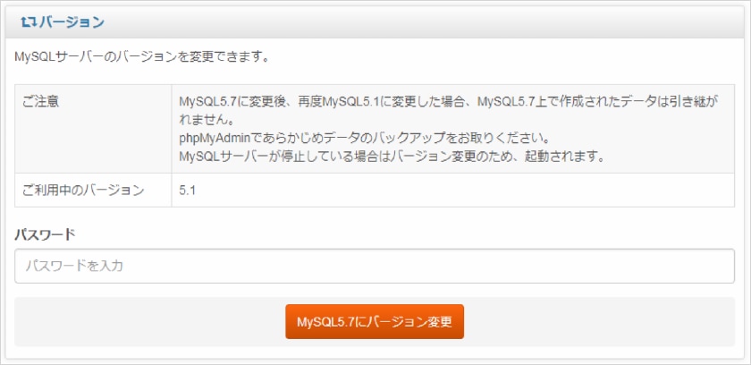 ※ MySQLのバージョンアップのみを行う機能です。MySQL5.1で作成されたデータベースの内容によっては、MySQL5.7に正しく移行できず、ホームページ表示に影響を及ぼす可能性があります。