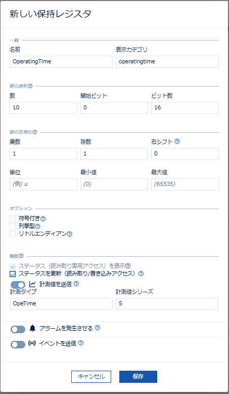 本レシピでは、稼働時間(OperatingTime)の値と交換時期(Replacement)を教えてくれるアラームを受け取るプロトコルを作ります。